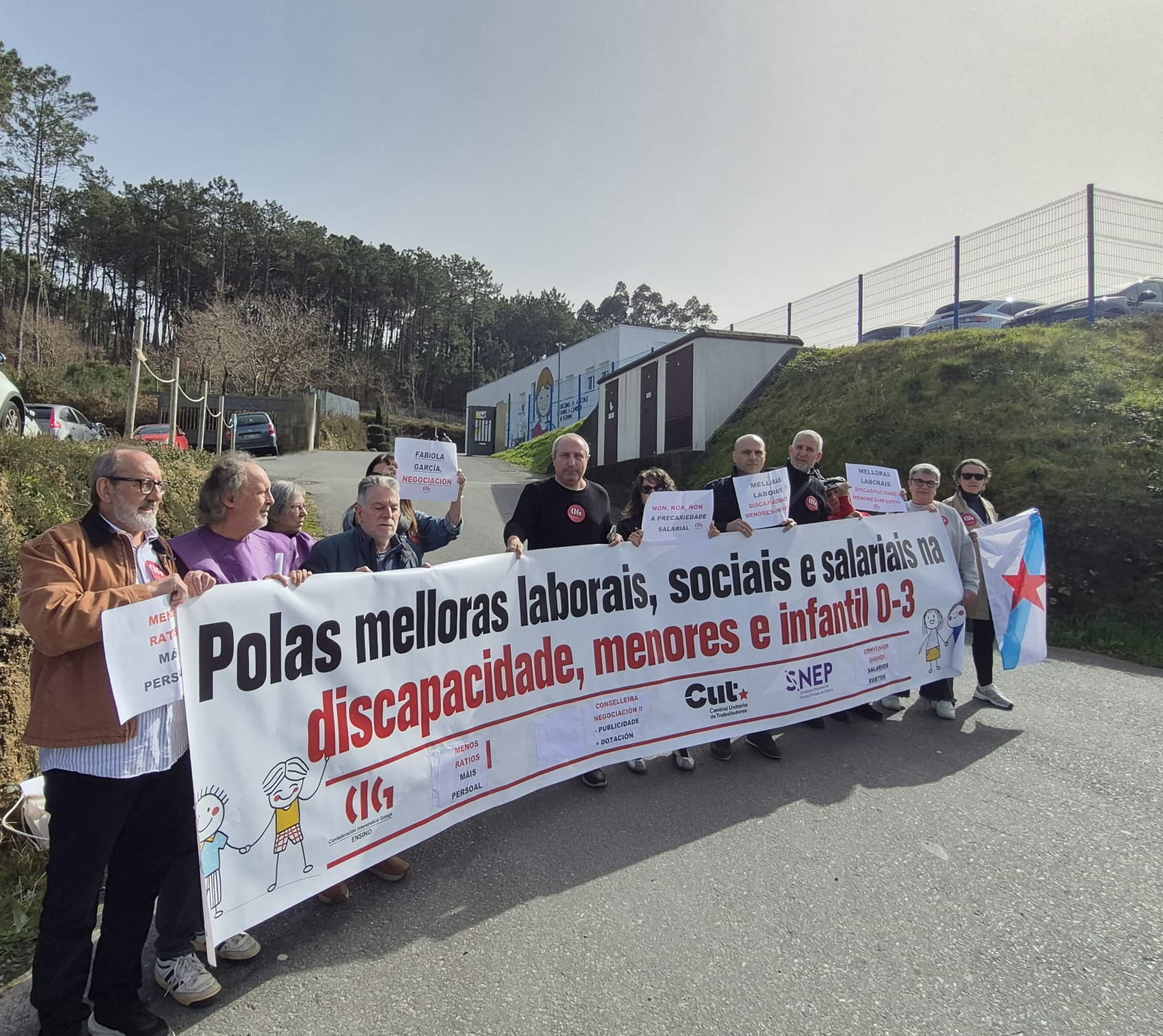 Representantes da CIG-Ensino, CUT e SNEP concentráronse diante das instalacións de Amicos en Boiro ante a visita da conselleira Fabiola García, para esixirlle que reciba e escoite o persoal traballador nas súas reivindicacións e na mellora da calidade do servizo.