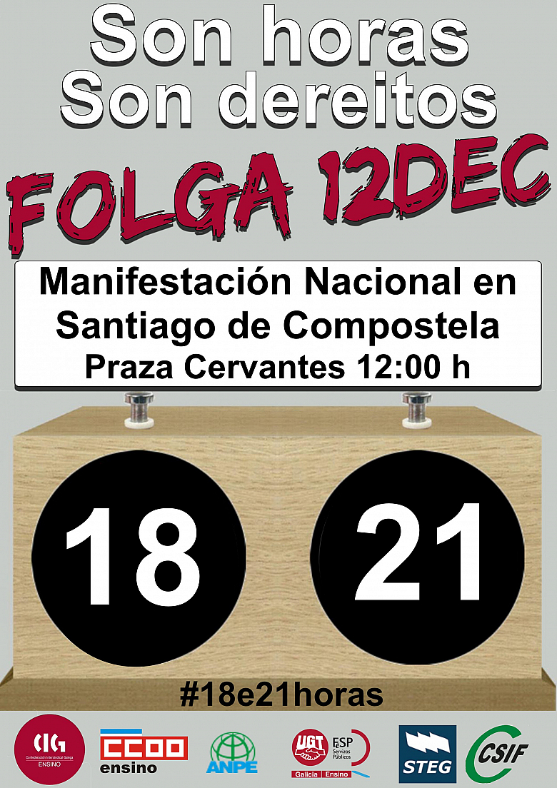 As organizacións sindicais do ámbito do ensino público de Galiza seguen adiante co calendario reivindicativo previsto, logo da marcha cara a San Caetano do día 13 de novembro e das concentracións que tiveron lugar nas sete cidades o pasado xoves 21. Nesta data a CIG-Ensino xa remarcaba que a folga era a única saída á que nos levaba unha posición da Consellaría absolutamente contraria aos dereitos do profesorado e dun mutismo total fronte ás demandas de abrir unha negociación para aplicar a redución horaria de 18 e 21 horas en secundaria e primaria respectivamente, nun momento no que sete comunidades autónomas xa o fixeron.