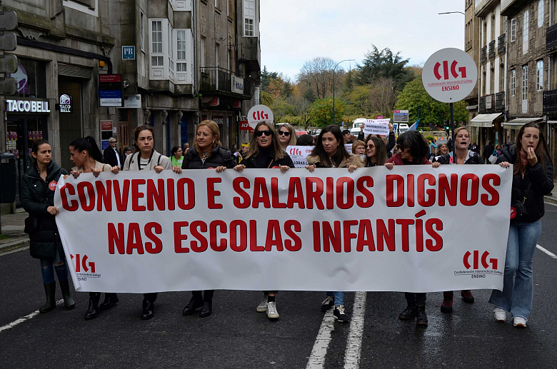 O malestar e o enfado entre as traballadoras das escolas infantís da etapa 0 a 3 anos non deixan de aumentar, tal e como se puido constatar hoxe tanto no seguimento, cifrado nun 80% tendo en conta os abusivos servizos mínimos impostos xa non só polas empresas senón tamén pola Xunta e algunhas administracións locais, como na asistencia á manifestación unitaria en Compostela. Na marcha, na que participaron arredor de 800 traballadoras (no sector en Galiza traballan 2000 e moitas delas viron conculcado o seu dereito á folga) que saíu da Alameda con chegada a Praterías, previa parada diante da Confederación de Empresarios de Galiza, coreáronse consignas como "A nosa vocación non paga facturas", "Nin garderías nin xardíns, somos escolas infantís", "Non pode ser, non pode ser, coidar os vosos fillos e non chegar a fin de mes", "Patronal, escoita, estamos en loita" ou "Se somos esenciais cobremos como tais".