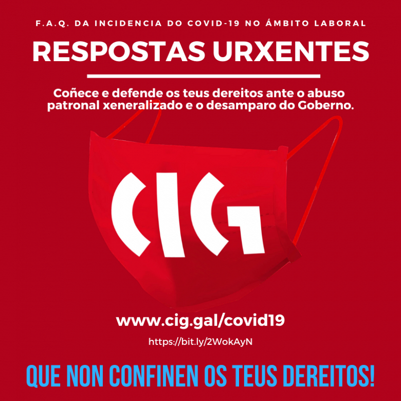 Neste espazo informativo preténdese dar resposta ás cuestións máis comúns que se están a repetir estes días: problemas para conciliar o traballo co coidado de crianzas e familiares a cargo, persoas que foron diagnosticadas co virus ou que teñen que manter corentena por estar en contacto con este, modificación substancial das condicións de traballo aproveitando esta crise, como a modificación do período de vacacións, aplicacións de ERTE´s por causa de forza maior, despedimentos, xestións ante o SEPE... Para calquera dúbida ao respecto destas cuestións e doutras que poidan xurdir aconsellamos consultar esta páxina e dirixirse preferentemente por correo electrónico ou por teléfono ao local do sindicato máis próximo. Lembramos que para minimizar as posibilidades de contaxio deben evitarse os desprazamentos innecesarios.