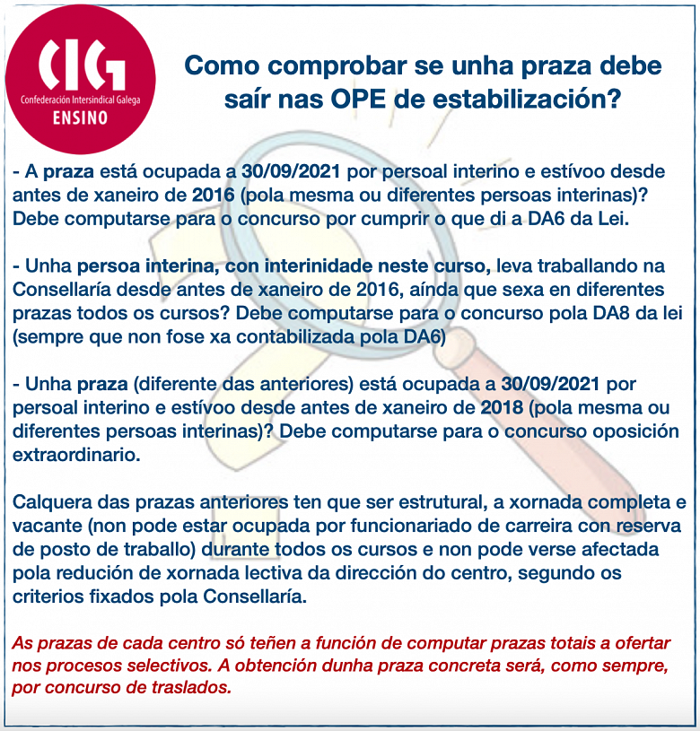 A CIG-Ensino, partindo da información remitida pola Consellaría, pon a disposición de todo o profesorado a documentación necesaria para poder facer unha revisión de todas e cada unha das prazas que a administración oferta polas disposicións adicionais 6 e 8 para o concurso excepcional e artigo 2º para o concurso oposición.