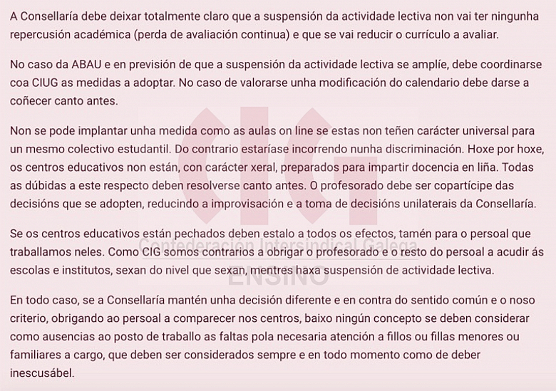 Se os centros educativos están pechados deben estalo a todos os efectos, tamén para o persoal que traballamos neles. Como CIG somos contrarios a obrigar o profesorado e o resto do persoal a acudir ás escolas e institutos, sexan do nivel que sexan, mentres haxa suspensión de actividade lectiva.